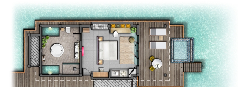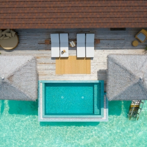 If snorkeling is your thing, (or sunbathing and soaking in views is more your thing), the Ocean Overwater Villa is ideal. Situated just a few meters away from the house reef, this villa has some of the finest uninterrupted ocean views around.