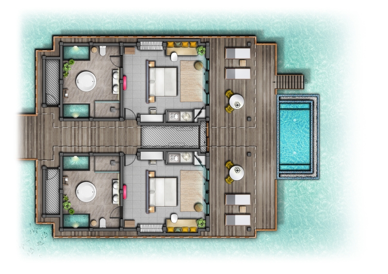 Just warning you now, you’re probably never going to want to leave once you’ve checked in to our 221 square meter 2 Bedroom Lagoon Overwater Villa. Perfect for friends or families traveling together (sleeps up to six people), these two villas are connected by a shared private deck and large plunge pool so you have plenty of space for togetherness and plenty of space for when you need a break, too.