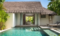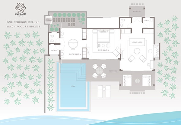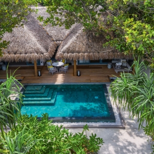 The epitome of luxury beach hideaway, One Bedroom Deluxe Beach Pool Residence offers a serene space amidst lush tropical gardens. Featuring the same authentic interior design characteristics of our guest villas, this luxurious residence has been enhanced even further with a separate living room, spacious beachfront terrace, a private pool and bathroom all facing the azure waters of the lagoon.