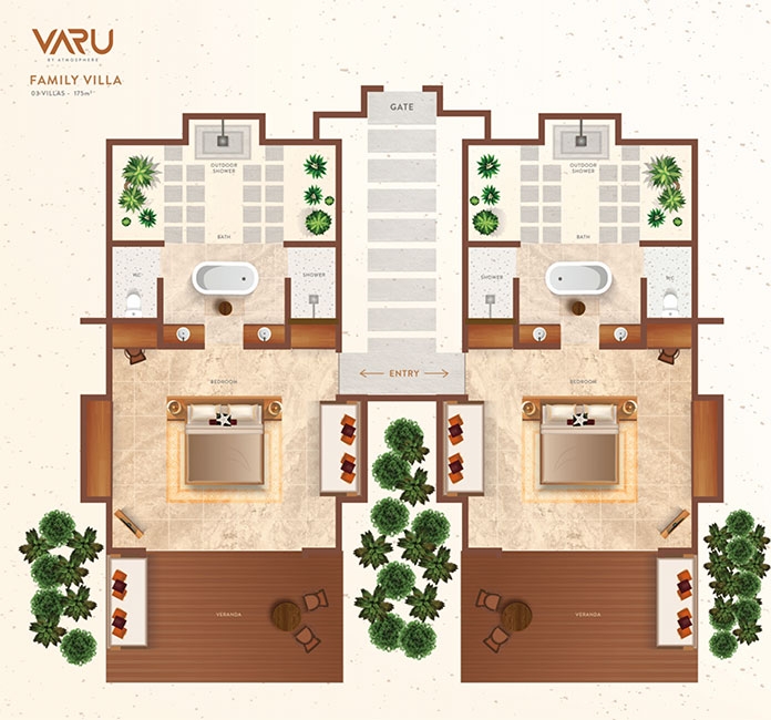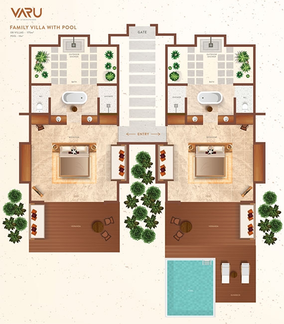 A large sliding glass door leads to a wooden veranda flanked by a lush tropical garden. Relax on the comfortable sun loungers and enjoy the ocean views. Or engage your brain cells and have some fun with a beautiful board game, thoughtfully placed on the side table. The master bedroom veranda comes with the option of a 10-square-meter private plunge pool with a wooden sundeck.