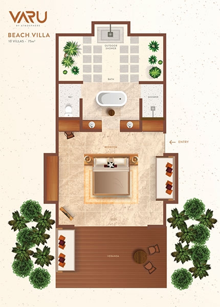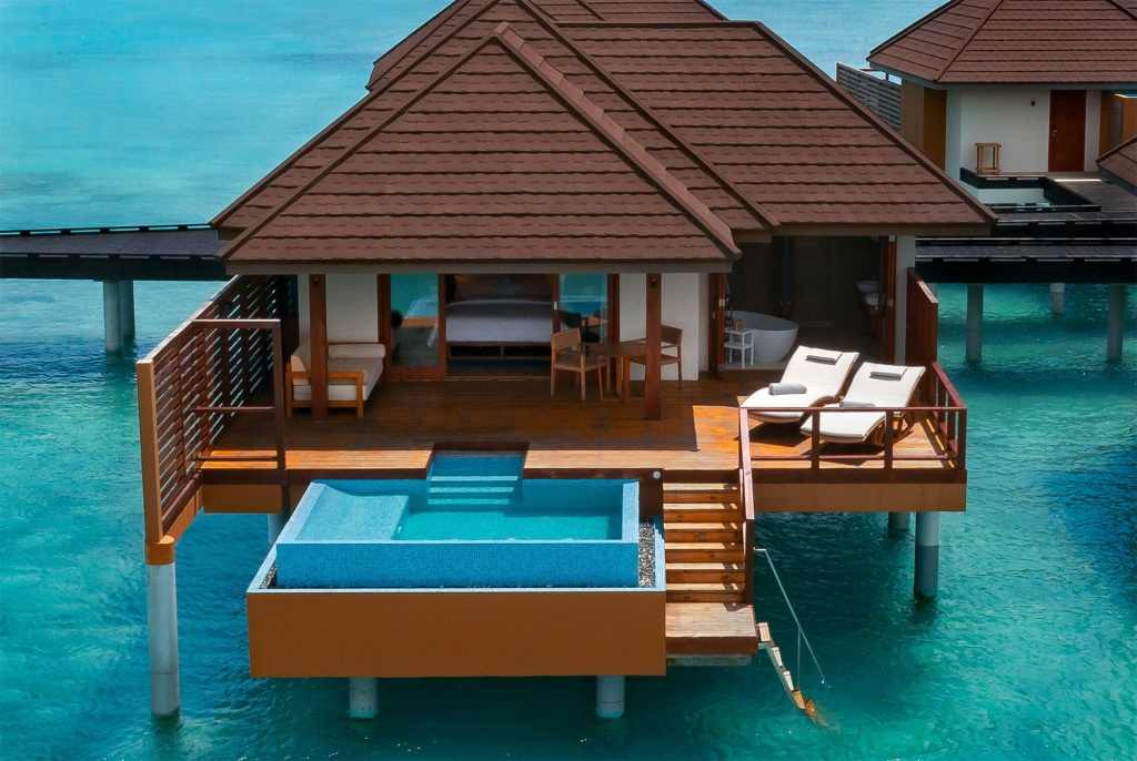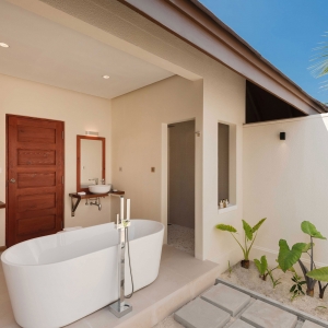 An elegant palette of cream, brown and cerulean highlights the atmosphere of airy, understated luxury. A huge glass sliding door brings in the natural light. Step out to the spacious veranda and soak in the morning sunshine. Relax on the inviting rattan and hardwood sunbeds. The water villas come with the option of a 10-square-meter pool to enjoy a cool dip in your private infinity pool.