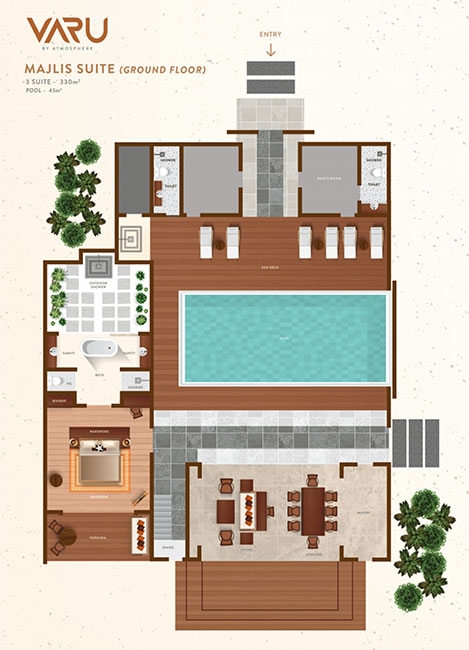 Surrounded by lush tropical gardens and with easy access to the beach, our three exclusive Majlis Suites are an oasis of tranquillity. A private entrance opens to your dreamy villa by a gently curving, white, sandy beach. Built around a beautiful courtyard with a stunning 45-square-meter private plunge pool, the villa comes with two bedrooms, one on the ground floor and the other on the first floor, and a vast living-cum-dining room with an adjoining mini-library. A room for the au pair ensures there’s ample privacy to enjoy undisturbed family time.