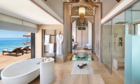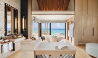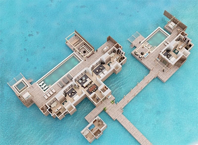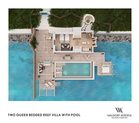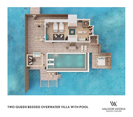 Embrace the ocean's beauty with floor-to-ceiling windows and sliding doors for glorious views over the sparkling ocean to the far horizon. Relax with two queen-sized, Waldorf Astoria beds and state-of-the-art audio-visual entertainment. The bathroom has a soaking tub and indoor and outdoor showers, while a glass floor in the dressing room reveals the tropical reef and fish below. Outside, swim in the pool or the ocean, dine in the pavilion or laze on the daybed or in the overwater hammock.