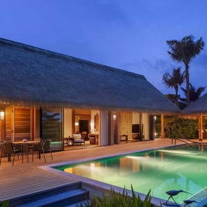 Enjoy a luxurious Maldivian experience in these spacious villas. Surrounded by a tropical garden, you’ll find an extensive wooden deck, private pool, and two master bedrooms.